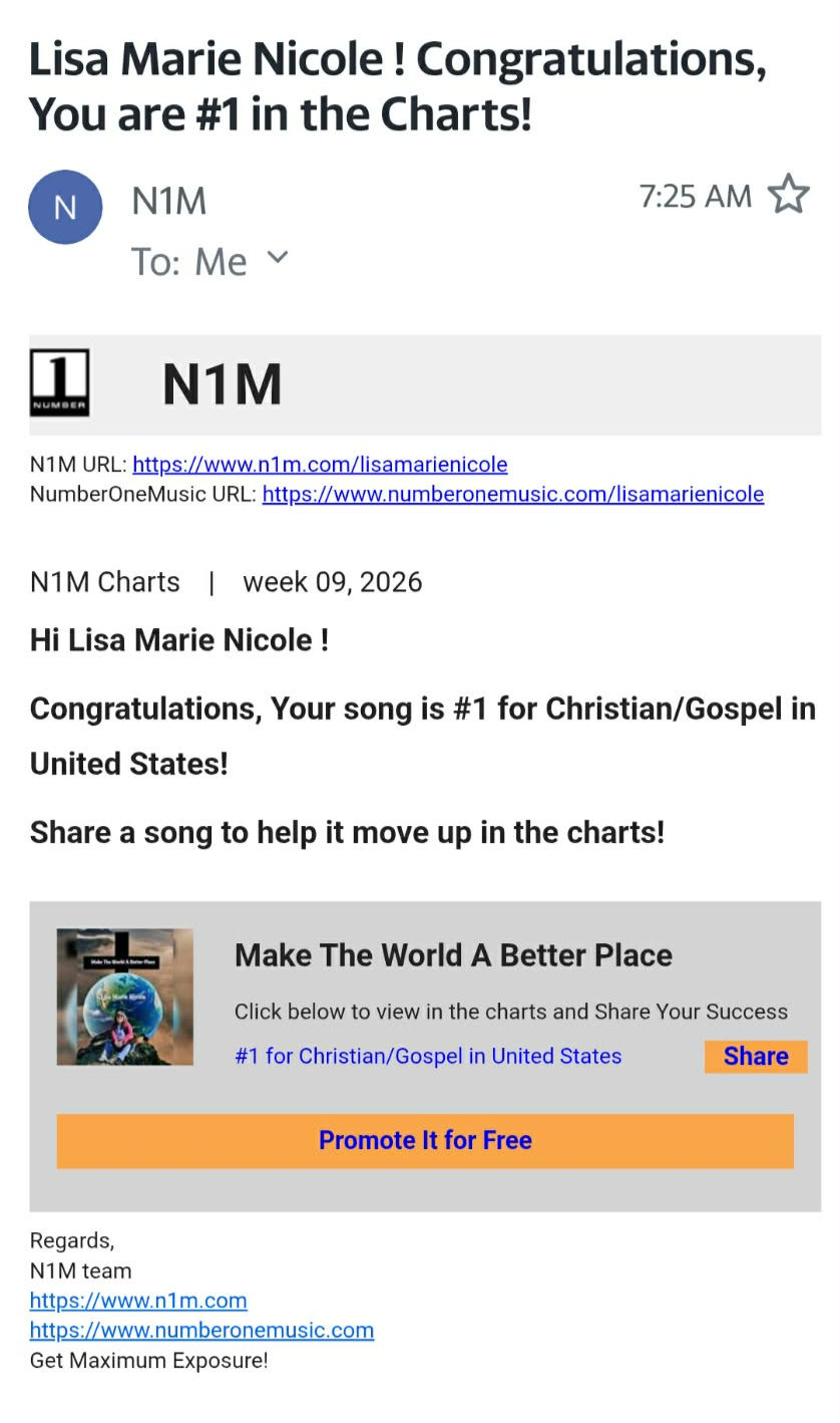In addition to countless other awards and nominations, Lisa has now pulled the trifecta on the platform Number One Music. Lisa's song "Make the world a better place" now, simultaneously, holds the #1 position in the Florida, United States and Worldwide rankings. An incredible achievement for an incredible person on an incredible network.